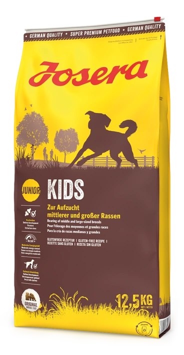 Josera Kids to karma dla wszystkich młodych psów ras średnich i dużych w okresie wzrostu. Receptura karmy o zmniejszonej wartości energetycznej z odpowiednio dobranym poziomem białka i tłuszczu wpływa na rozwój kości i stawów.