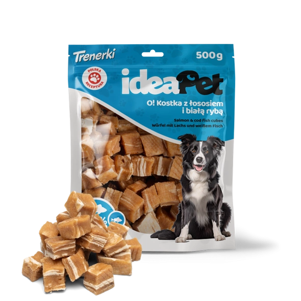 ideaPet Kostka z łososiem i białą rybą to przysmak, który łączy liczne korzyści zdrowotne, dzięki wyjątkowemu składowi. Łosoś i dorsz to doskonałe źródła białka i kwasów tłuszczowych omega-3, które wspierają zdrowie serca, skóry i sierści psa, a także wzmacniają układ odpornościowy. Mięso z kaczki oraz wątróbka kacza dostarczają nie tylko białka, ale również witamin i minerałów, takich jak witamina A, B12, żelazo i cynk, które wspomagają prawidłowe funkcjonowanie organizmu. Kształt kostki sprawia, że przysmak jest łatwy do podania, idealny do kontrolowanego porcjowania, a także doskonały do nagradzania psa w trakcie treningu.