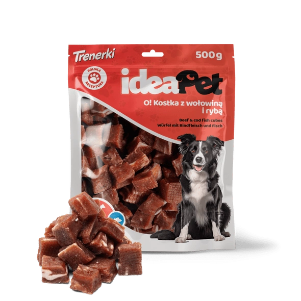 ideaPet Kostka z wołowiną i rybą to smakowity przysmak dla psa, który łączy wołowinę, mięso z kaczki, dorsza oraz płuca wołowe, zapewniając wyjątkowy smak i wartości odżywcze. Wołowina i płuca wołowe dostarczają cennego białka oraz wspomagają zdrowie mięśni i regenerację tkanek, a mięso z kaczki jest lekkostrawne i bogate w aminokwasy oraz minerały. Dorsz natomiast, będący źródłem kwasów omega-3, korzystnie wpływa na kondycję skóry i sierści. Kostki mają formę łatwych do pogryzienia kawałków, co sprawia, że są idealne dla psów w każdym wieku.