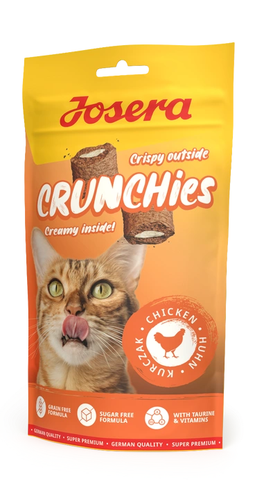 Wow, ale chrupiące! Nasze przekąski Josera Crunchies Chicken oferują o wiele więcej - ponieważ wypełnione są kremowym nadzieniem z pysznym kurczakiem dla głodnych kociaków! Te bezzbożowe i niskokaloryczne przysmaki to idealna przekąska na każdy dzień.