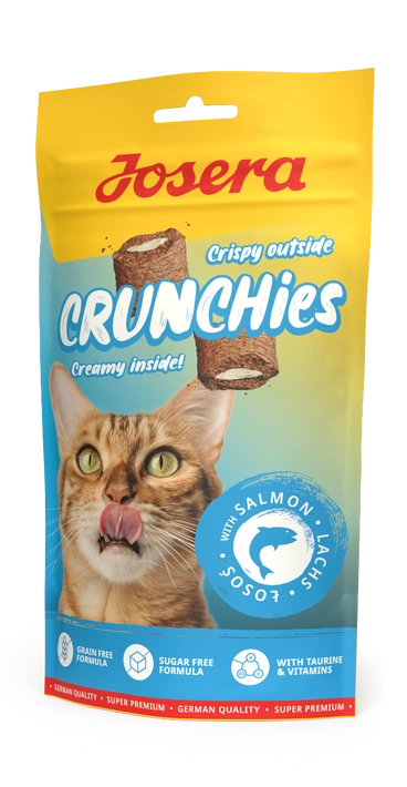 Oczywiście, że nasze koty uwielbiają ryby! A Josera Crunchies with Salmon zawierają w sobie pysznego łososia. Który kot mógłby się temu oprzeć? Kiedy chrupiąca skorupka pęka w pyszczku, kremowe nadzienie jest prawdziwą ucztą dla podniebienia. Bezzbożowe i niskokaloryczne przysmaki są idealną przekąską na każdy dzień - i nie tylko.