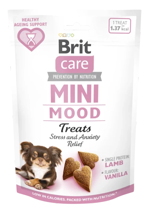 Brit Care Mini Treats Mood z jagnięciną, pomagają radzić sobie ze stresem i sprzyjają spokojnemu zachowaniu dzięki zawartości konopi, waleriany i L-tryptofanu. Brit Care Mini Treats to nie tylko smakowita przekąska, ale też codzienne wsparcie zdrowia niewielkiego pupila. Starannie dobrane składniki mają za zadanie wspierać zwierzę w najczęstszych problemach zdrowotnych dotykających psów małych ras. Dostosowane są także do ich szybszego metabolizmu i delikatnych układów pokarmowych. W trosce o zachowanie jak najlepszej formy smakołyki mają niezwykle mało kalorii. Przysmaki są bezzbożowe, oparte na jednym źródle białka pochodzenia zwierzęcego. Nie zawierają soi, sztucznych barwników, ani GMO. Cała linia wzbogacona jest kwasami fulwowymi, wspierającymi absorpcję składników, ekstraktem z melona kantalupy, naturalnego źródła antyoksydantów oraz probiotykami, wspierającymi trawienie i odporność.