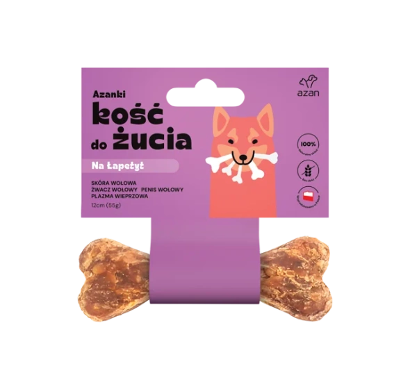 Azanki Kość do żucia NA ŁAPETYT ze żwaczem i penisem wołowym to wyśmienity przysmak dla dorosłych psów małych oraz średnich ras, zaspokajający ich naturalną potrzebę gryzienia i żucia. Połączenie wysoce aromatycznych, wołowych składników: żwacza oraz penisa, zawiniętych w skórę, stanowi niezwykle kuszącą, naturalną przekąskę, nęcącą swoim atrakcyjnym zapachem i smakiem nawet psie niejadki oraz szczególnie wybredne osobniki! Kości nie zawierają ostrych i kruchych elementów, stanowiąc bezpieczniejszą alternatywę dla rozmaitych gryzaków.