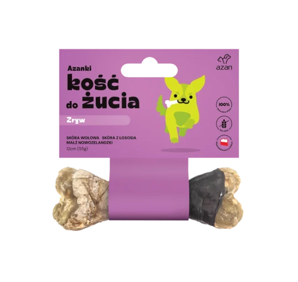 Azanki Kość do żucia ZRYW z małżami nowozelandzkimi, MSM i chondroprotektorami to wyśmienity przysmak dla dorosłych psów małych oraz średnich ras, zaspokajający ich naturalną potrzebę gryzienia i żucia. W kości znajduje się pełna skarbnica dodatków wspierających regenerację stawów: połączenie skóry wołowej i łososia, małżami nowozelandzkimi, MSM, mieszanka mineralna z alg czerwonych i muszli ostryg, siarczan glukozaminy oraz chondroityny. Kości nie zawierają ostrych i kruchych elementów, stanowiąc bezpieczniejszą alternatywę dla rozmaitych gryzaków.